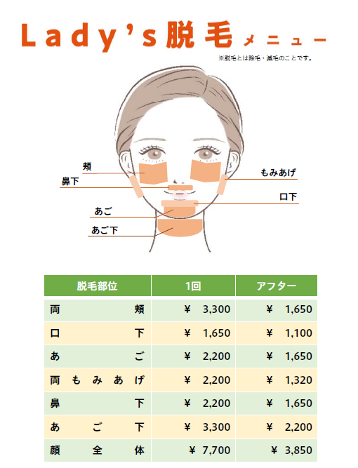 ※光脱毛は、永久脱毛では、ございませんので、いずれ伸びてくる可能性がございます。 ※完了後1年はアフター料金で脱毛を受けていただけます。 ※当店で脱毛を完了された方は、アフター料金をご利用下さい。